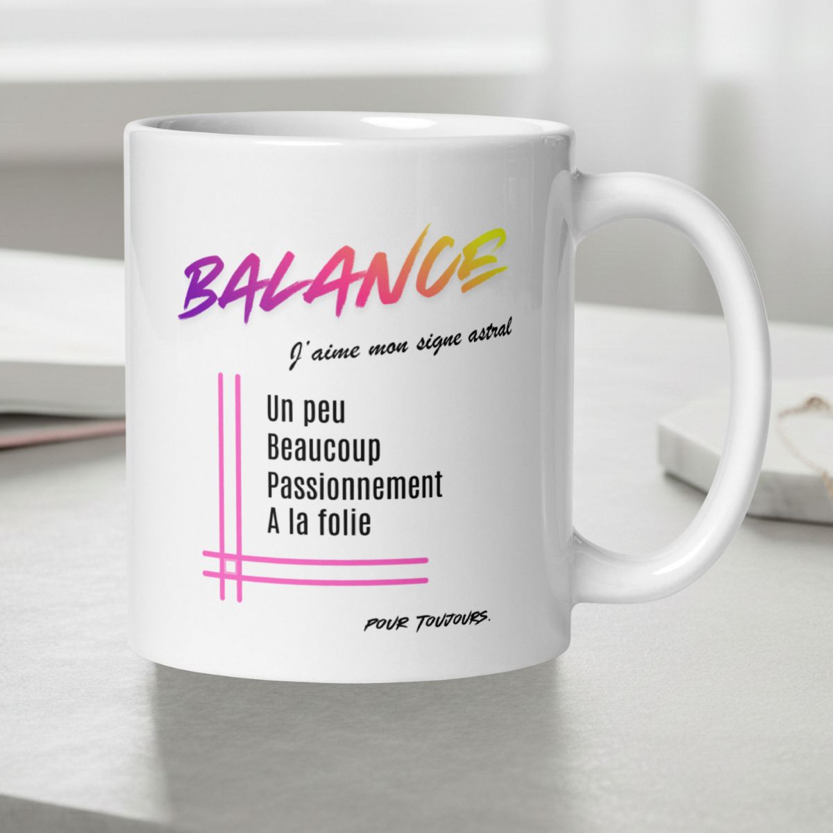 Vous êtes Balance et vous adorez votre signe ? Ce mug est fait pour vous. Avec le mot BALANCE et la formule culte « Un peu, Beaucoup, Passionnément, À la folie », il est le cadeau parfait pour toute femme Balance qui aime affirmer son identité astrologique avec passion. Un cadeau chic pour une amie, une sœur, ou simplement pour se faire plaisir !
