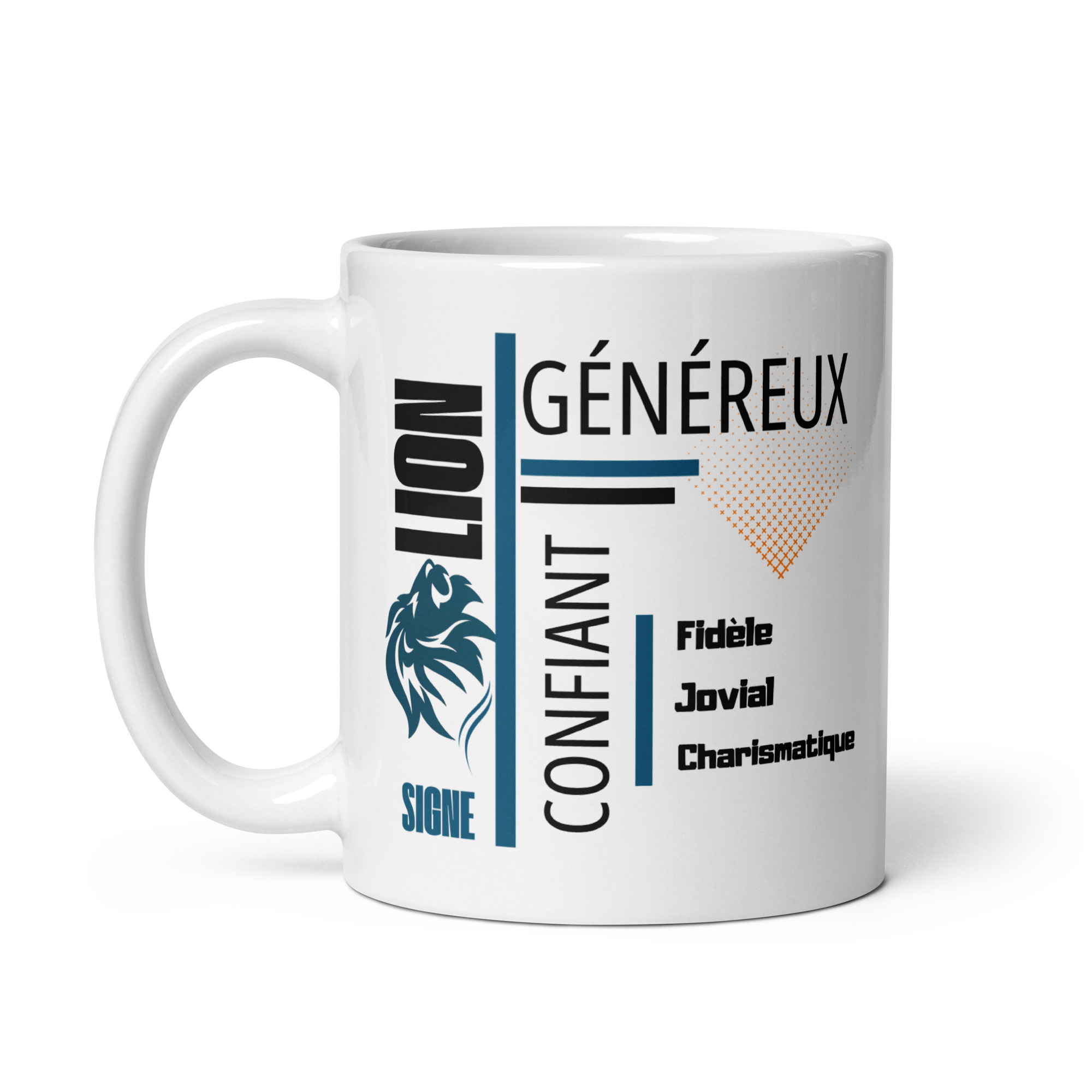 Esthétique typographique moderne. Le contraste entre le bleu profond, le noir intense et le carré dégradé orange apporte une touche artistique et dynamique. Les mots clés de la personnalité du Lion — Généreux, Confiant & Fidèle — y sont inscrits avec une mise en page structurée, faisant de chaque pause café un moment d’affirmation de soi. C’est un accessoire qui valorise le tempérament de ce signe du zodiaque.
