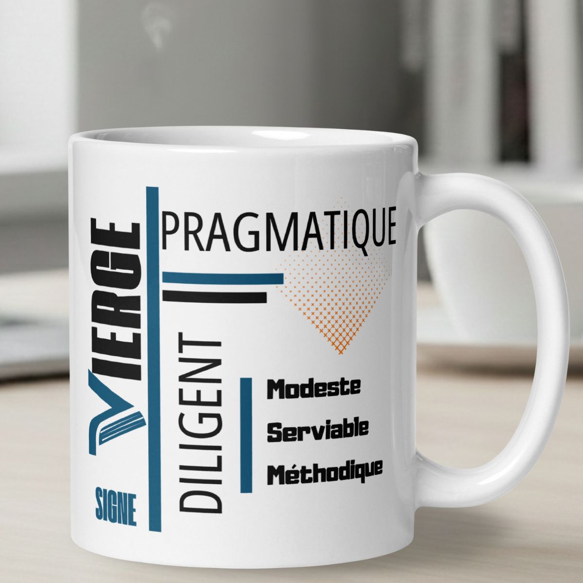 Esthétique typographique moderne. Le contraste entre le bleu profond, le noir intense et le carré dégradé orange apporte une touche artistique et dynamique. Les mots clés de la personnalité du Vierge — Pragmatique, Diligent et Modeste — y sont inscrits avec une mise en page structurée, faisant de chaque pause café un moment d’affirmation de soi. C’est un accessoire qui valorise le tempérament de ce signe du zodiaque.