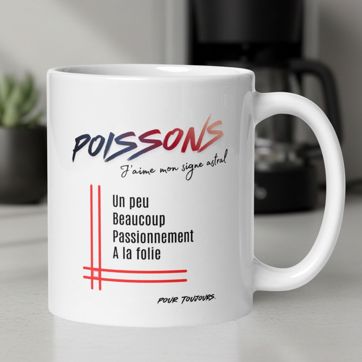 Votre signe, votre mug ! Affichez fièrement votre côté Poissons. Avec son message « Un peu, Beaucoup, Passionnément, À la folie », il exprime toute la fierté d’appartenir à ce signe d’eau. C’est le cadeau parfait pour les hommes qui adorent leur signe.