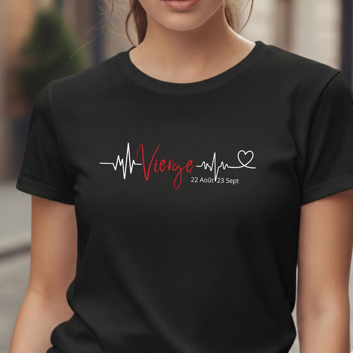 • Motif imprimé : Typographie manuscrite « Vierge ». Le visuel intègre une ligne de pulsation cardiaque (heartbeat) minimaliste et les dates astrologiques « 22 Août – 23 Sept ».