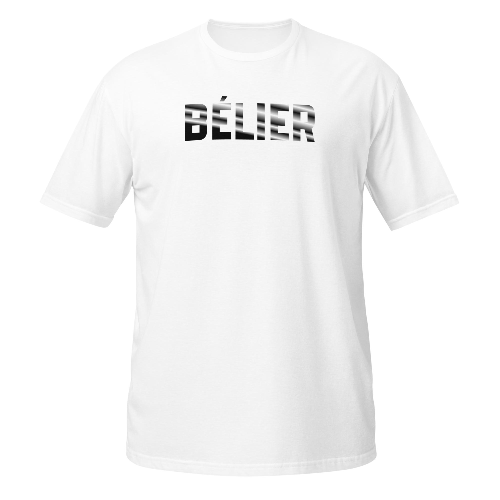 - Motif imprimé : Lettrage massif « BÉLIER » à rayures obliques.