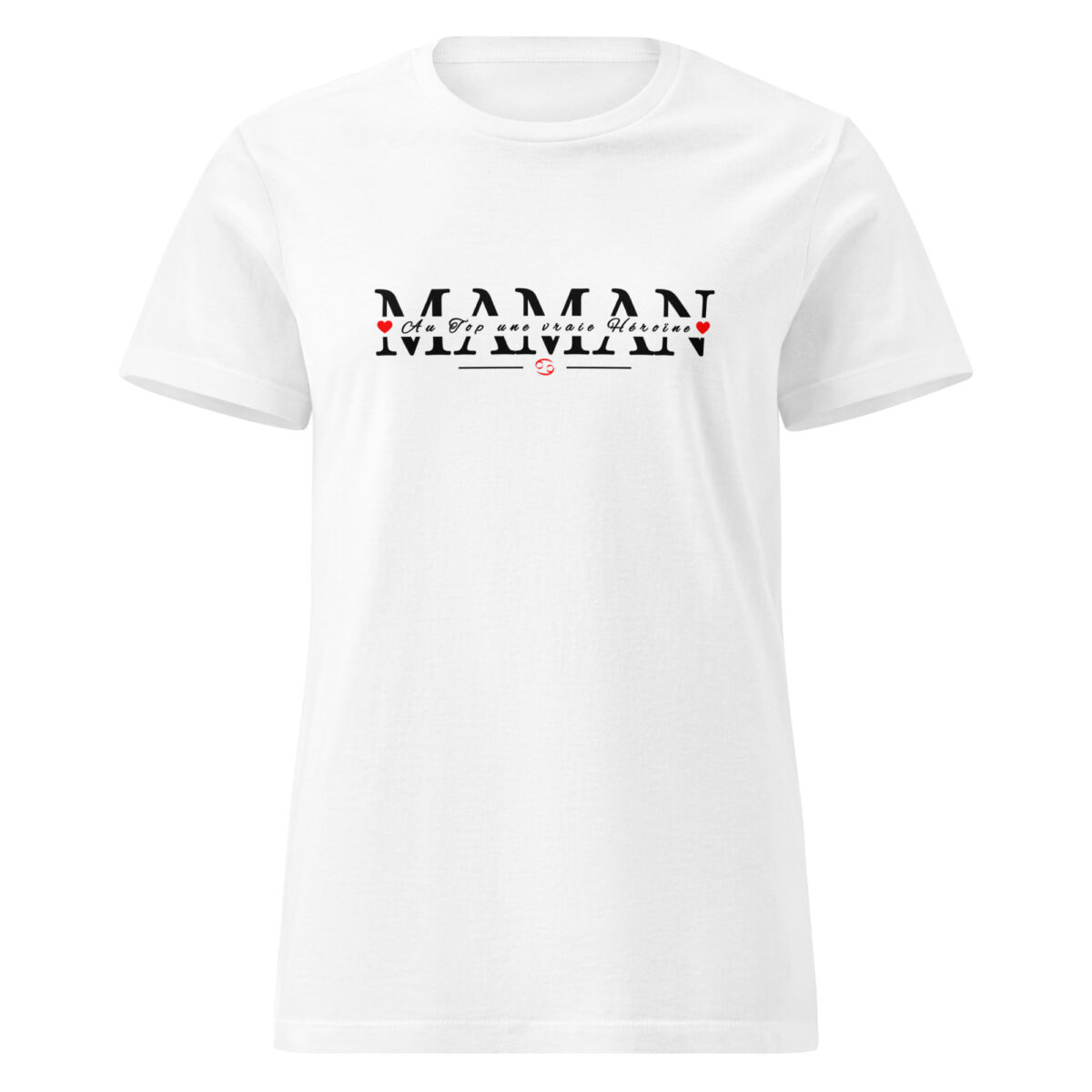 | Motif Imprimé : | Grand lettrage « MAMAN » noir au style affirmé. L’inscription « Au top, une vraie héroïne » et le symbole du signe zodiacal Cancer s’intègrent harmonieusement au centre du visuel. Design positionné sur l’avant du t-shirt, centré au niveau de la poitrine. |