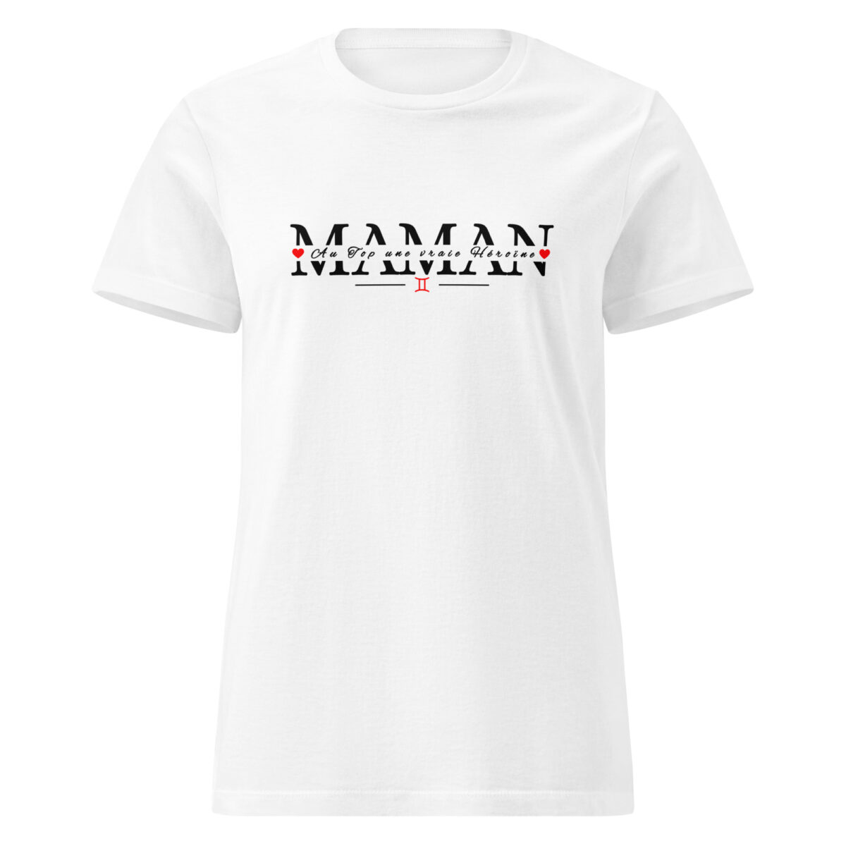| Motif Imprimé : | Grand lettrage « MAMAN » noir au style affirmé. L’inscription « Au top, une vraie héroïne » et le symbole du signe zodiacal Gémeaux s’intègrent harmonieusement au centre du visuel. Design positionné sur l’avant du t-shirt, centré au niveau de la poitrine. |