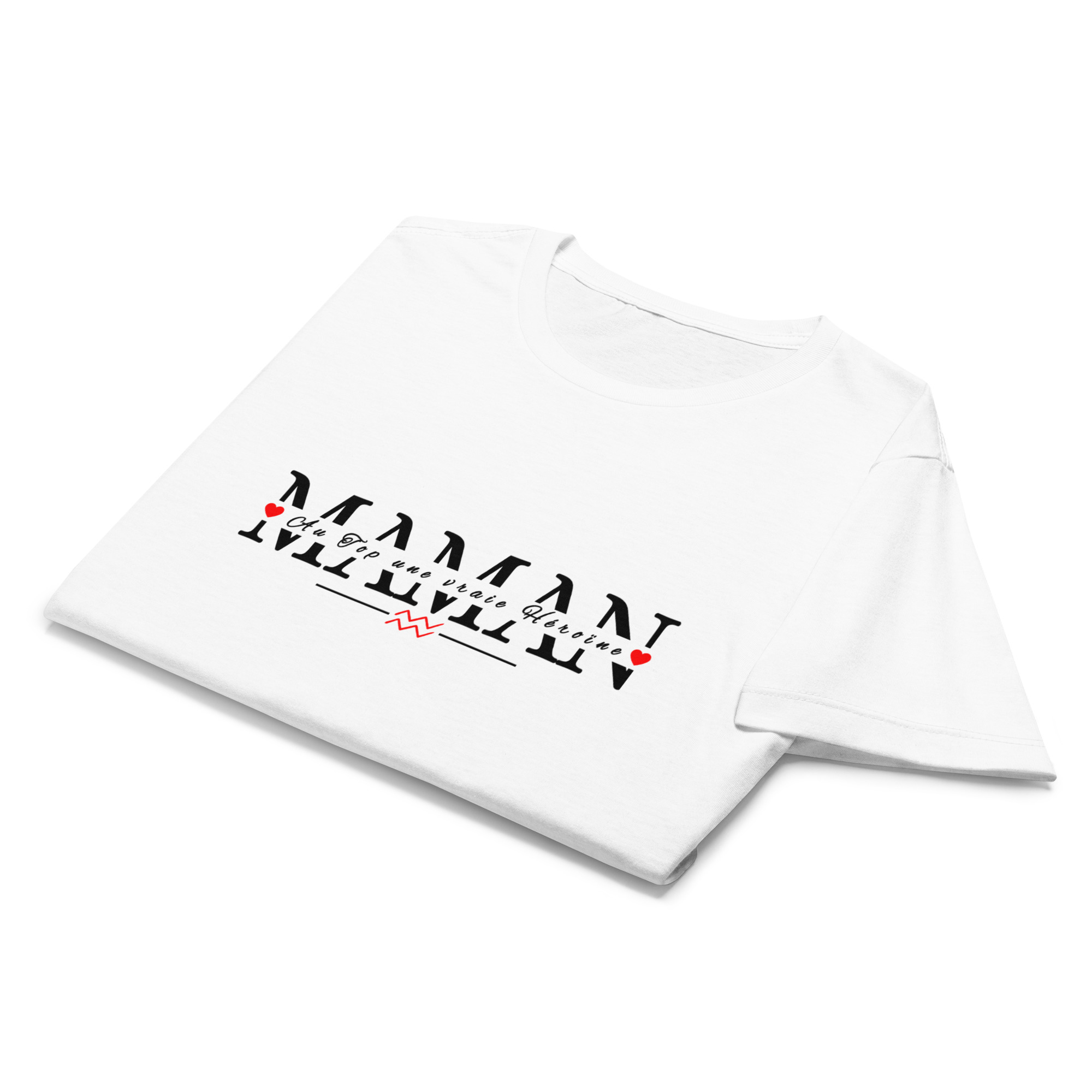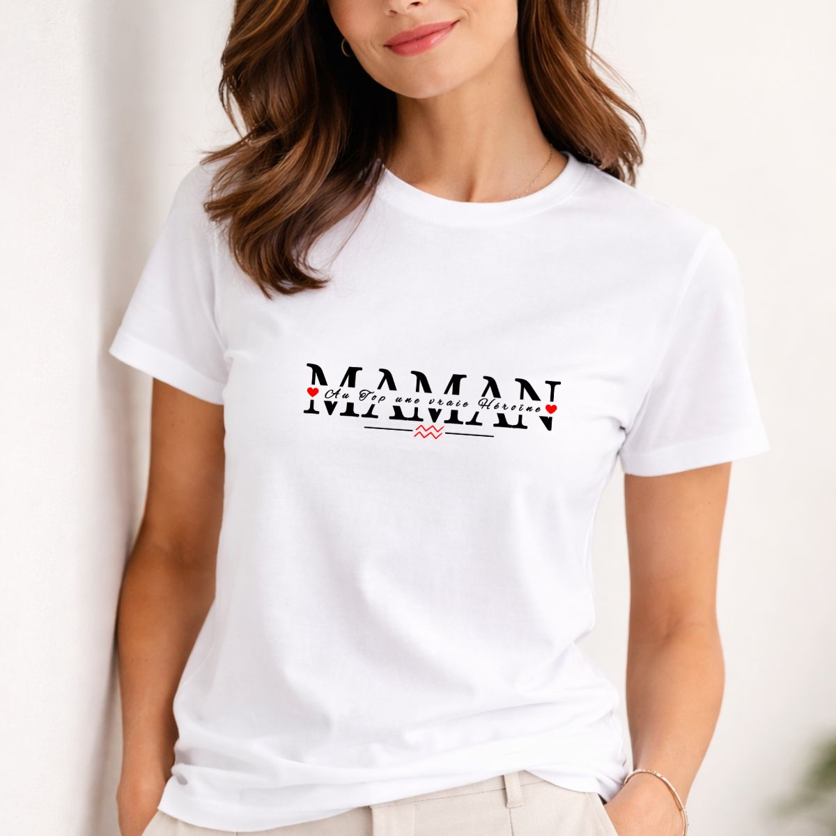 | Motif Imprimé : | Grand lettrage « MAMAN » noir au style affirmé. L’inscription « Au top, une vraie héroïne » et le symbole du signe zodiacal Verseau s’intègrent harmonieusement au centre du visuel. Design positionné sur l’avant du t-shirt, centré au niveau de la poitrine. |